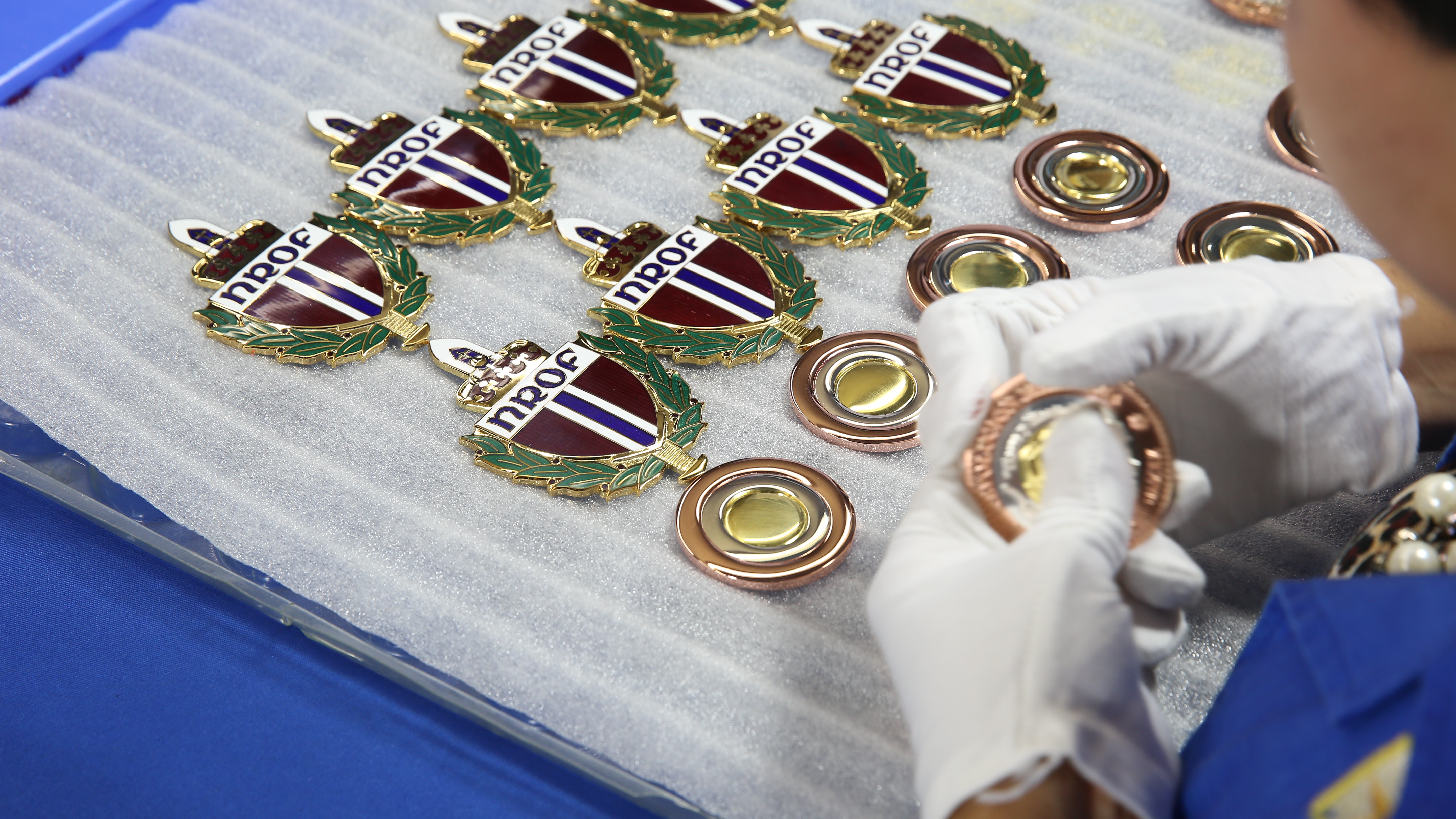 琺瑯徽章。即用琺瑯入色的方法制作的徽章,是最高端的入色工藝,常見于制作軍隊(duì)、國(guó)家機(jī)關(guān)證章及特別有紀(jì)念意義、要長(zhǎng)久保存的證章、紀(jì)念幣、勛章等。